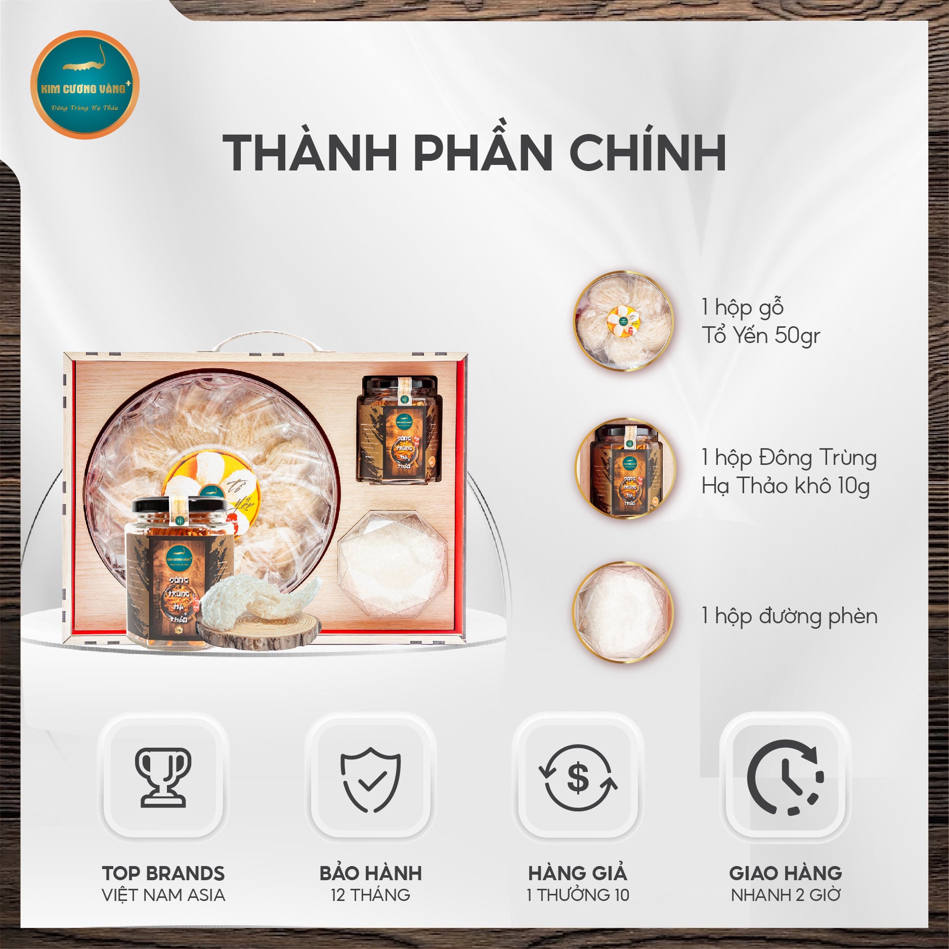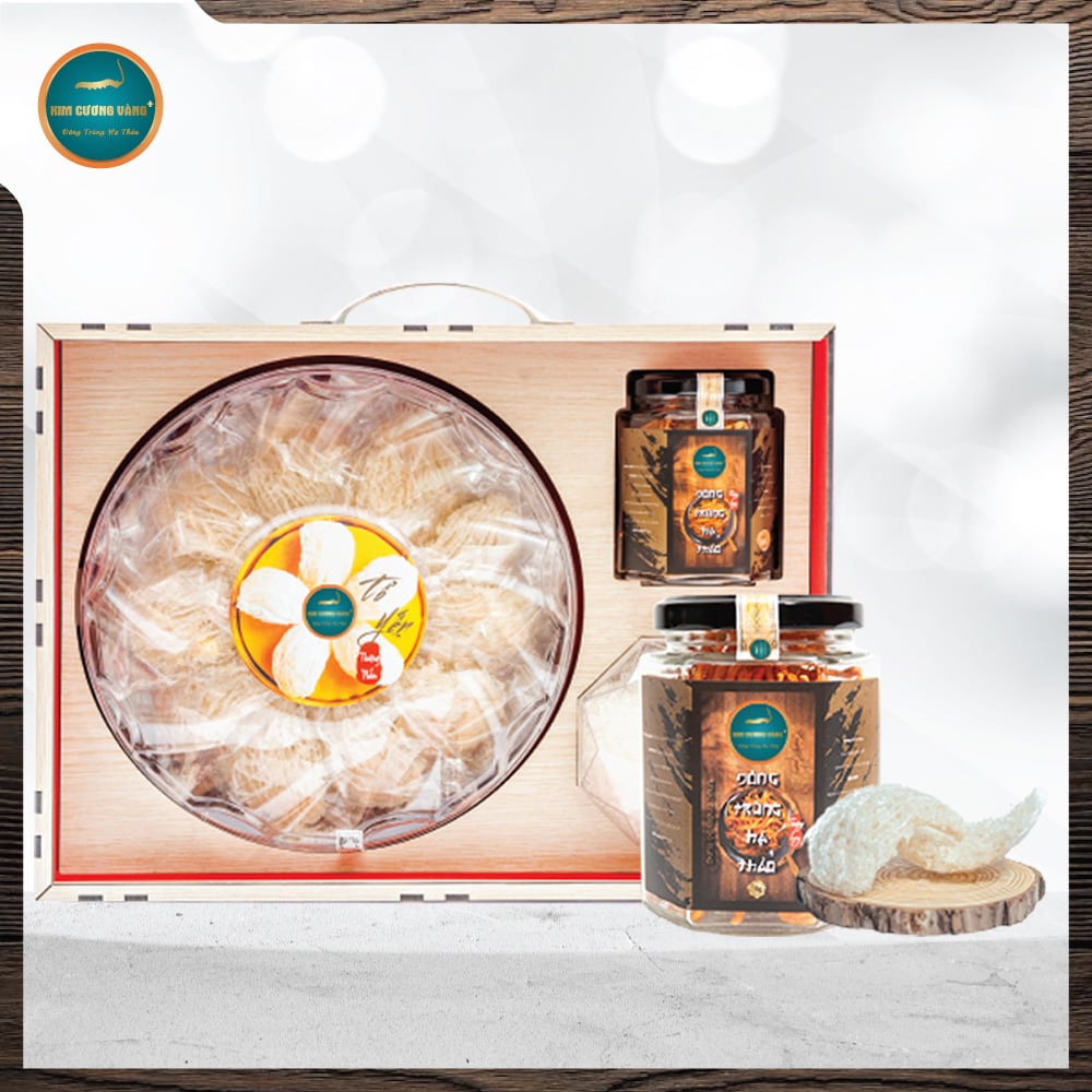 Quy cách đóng gói: Hộp gỗ Tổ Yến Tinh Chế 100gr + Hộp đường phèn + Đông trùng hạ thảo khô 10g.